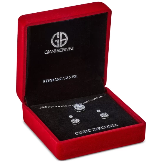 Elegant halo and solitaire stud earrings are paired with a halo pendant necklace in this cubic zirconia three piece jewelry set from Giani Bernini.